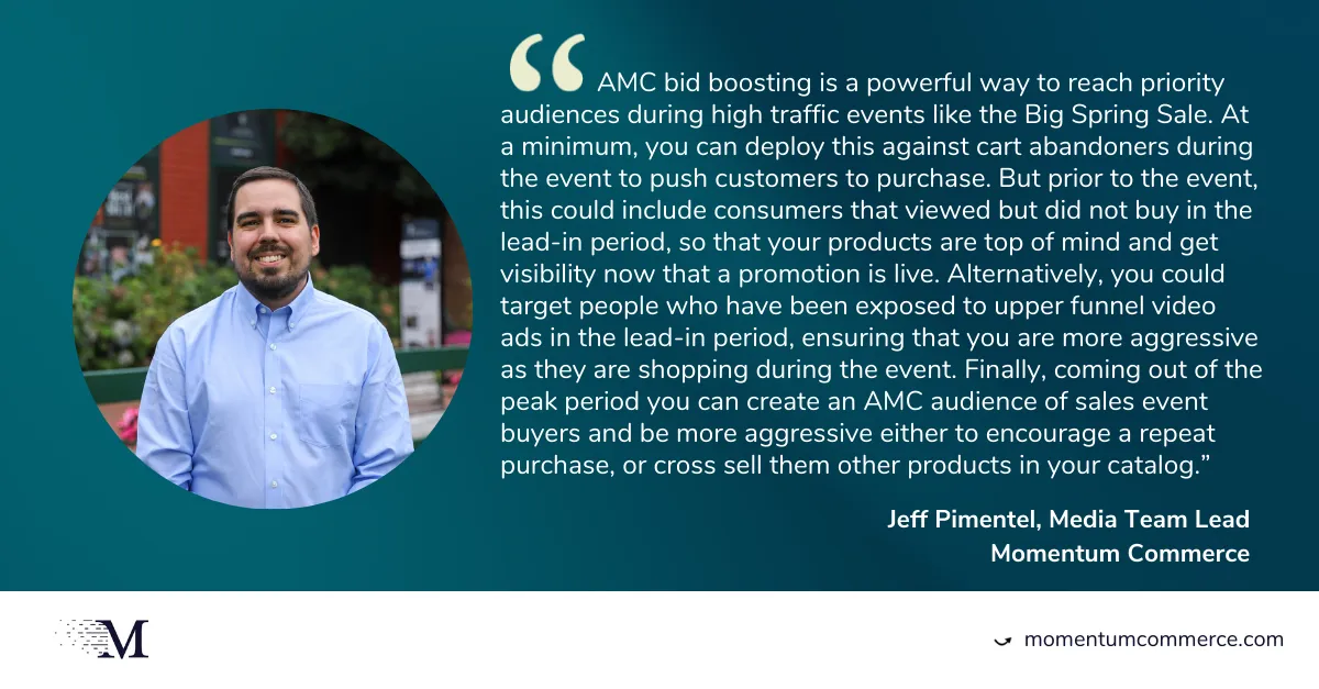 Amazon Marketing Cloud (AMC) is a critical part of ensuring that you’re reaching in-market buyers before, during, and after the sale event. This means leveraging the targeting options available in AMC in a kind of sequential manner, driving consumers through the funnel.