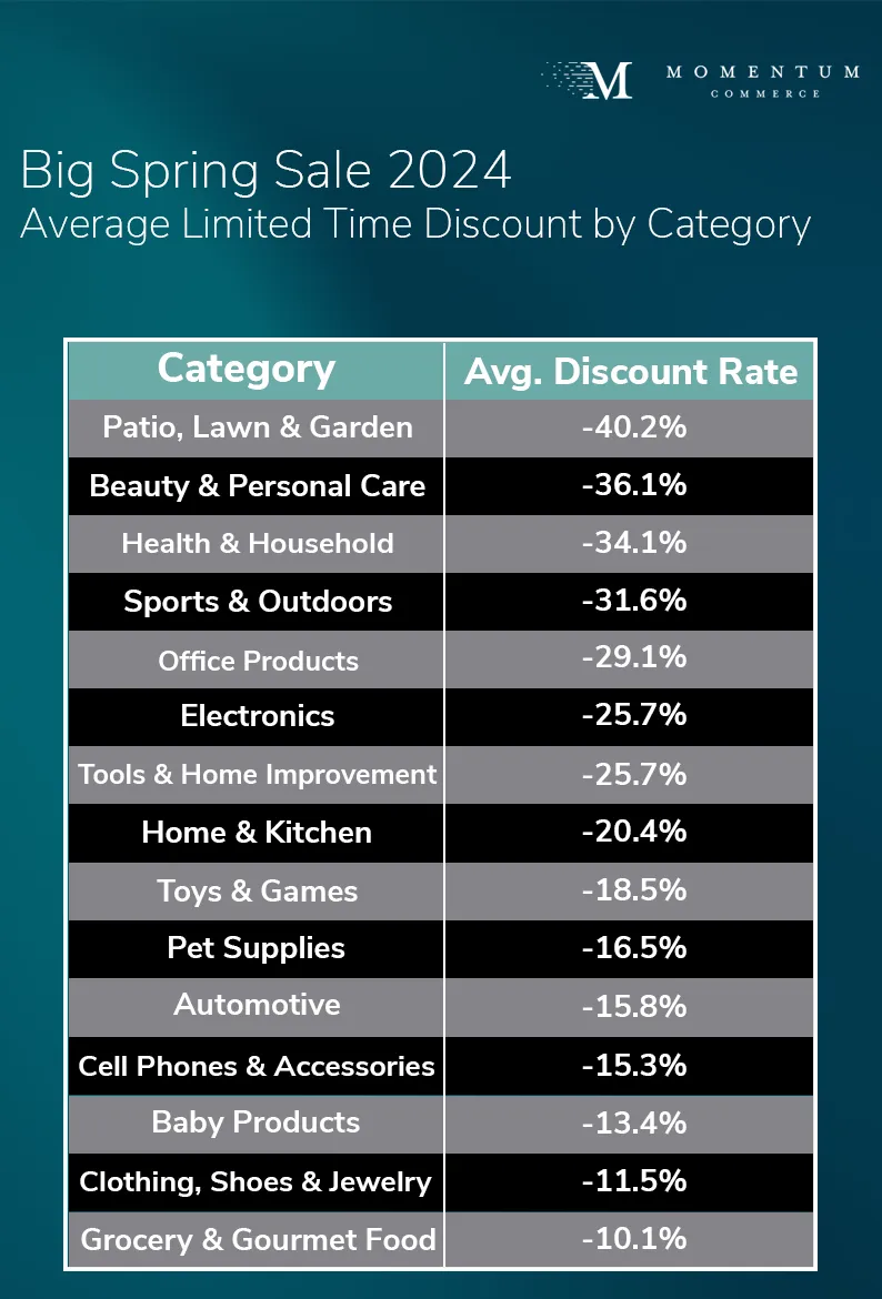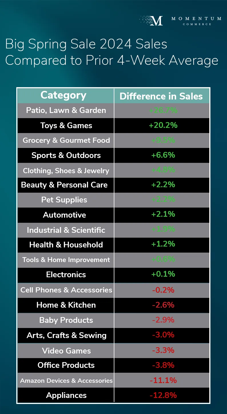 Once the Big Spring Sale 2025 gets underway, Momentum Commerce will publish data detailing performance across Amazon US including: