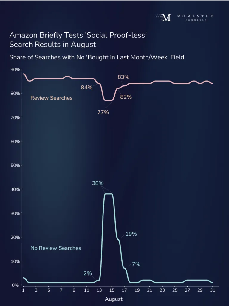 Amazon seems to not only be narrowing the scope of the test from a category point of view, but also expanding it in other ways. The ‘X bought in last week/month’ labels that often accompany a search result - which were present across more than 97% of ‘no review’ searches prior to the test - were gone from 38% of those searches during the test period. This largely eliminated any form of ‘social proof’ on the impacted SERPs.