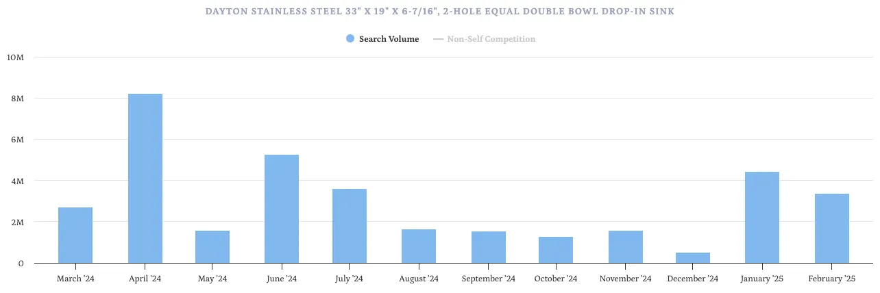 High-level, generic searches remain popular throughout the year with generic terms like "kitchen sink", "utility sink", and “farmhouse sink” accounting for a large plurality of category search volume
