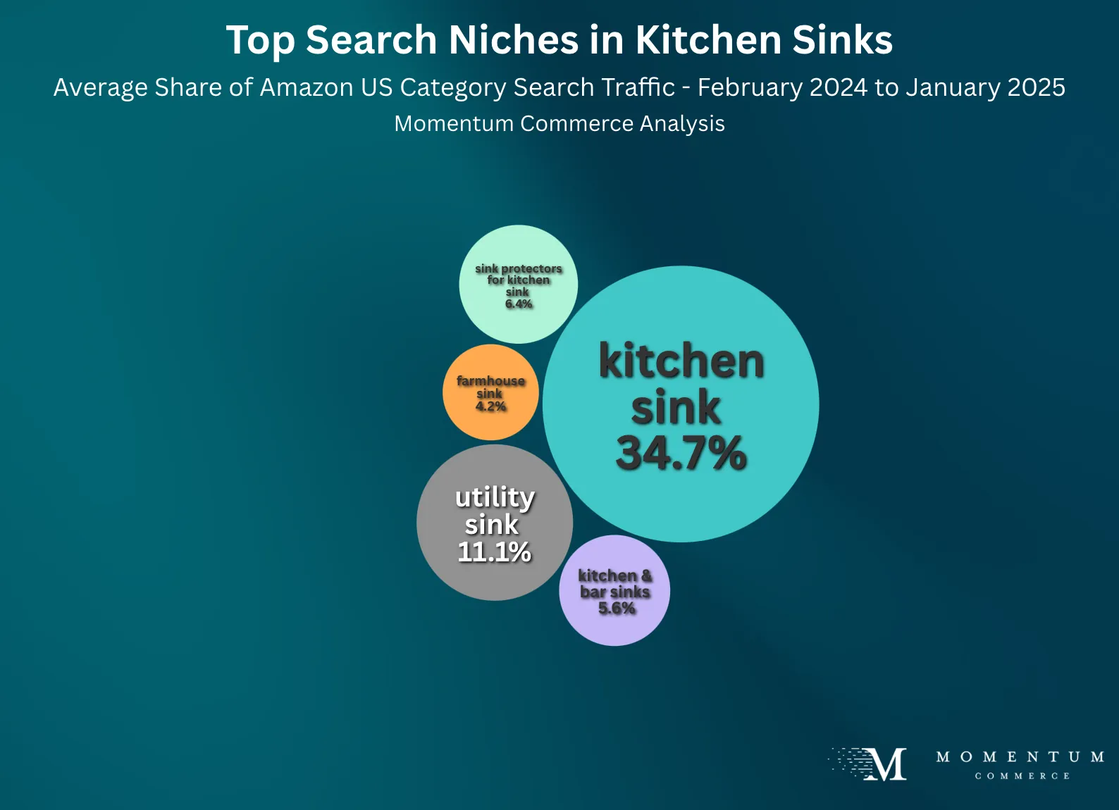 Analysis of search data reveals that Kitchen Sink category traffic concentrates around a small number of generic, high-level search niches. This concentration, combined with the category's seasonal patterns, creates highly competitive dynamics in terms of brand visibility.