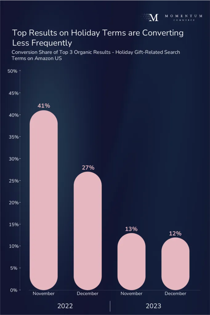 Momentum Commerce identified more than 2,700 search terms that were within the top one million search terms on Amazon during the month of November 2023 or November 2022 that contained “gift”, “gifts”, “present”, “presents”, “stocking stuffer”, “stocking stuffer”, or “toys for”, and also included no brand name. Additionally, search terms specifically referencing other events (e.g. birthday, easter, anniversary) were excluded from the analysis. Momentum Commerce then examined all products that appeared organically across the top 10 results on these searches between the dates of November 1 through December 22, 2022 and November 1 through December 22, 2023, including category, brand name and pricing information, for year-over-year comparisons.