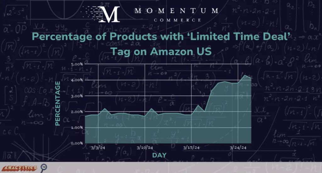 During the Big Spring Sale, an average of 3.7% of all products on Amazon US had the Limited Time Deal tag. Compare that with last Summer’s Prime Day(s) and Fall’s Prime Big Deal Days, when roughly 22% and 24%, respectively, of products had event-specific discount badges.