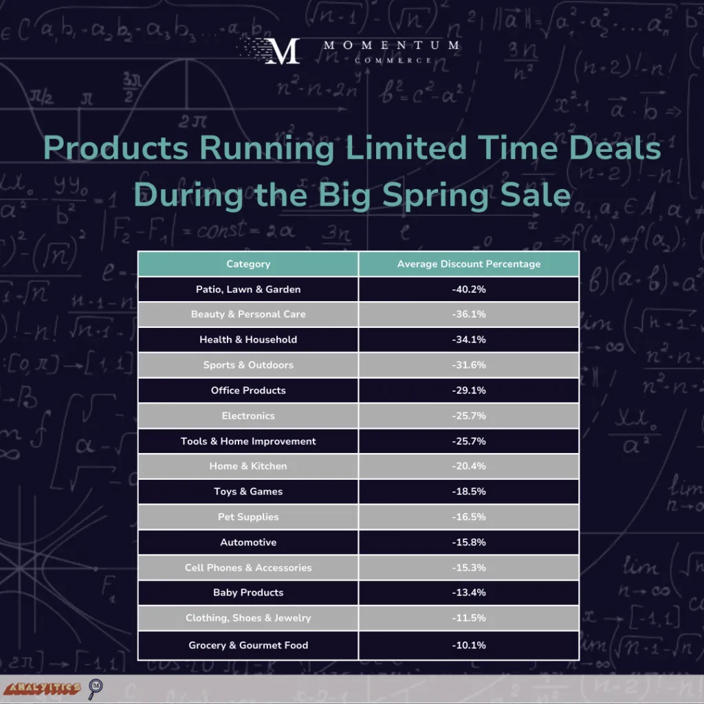 There was a good degree of variation in the depth of discounts on a category-by-category basis. At the top, Patio, Lawn & Garden, Beauty & Personal Care, and Health & Household all sported average Limited Time Discounts beyond 34%.