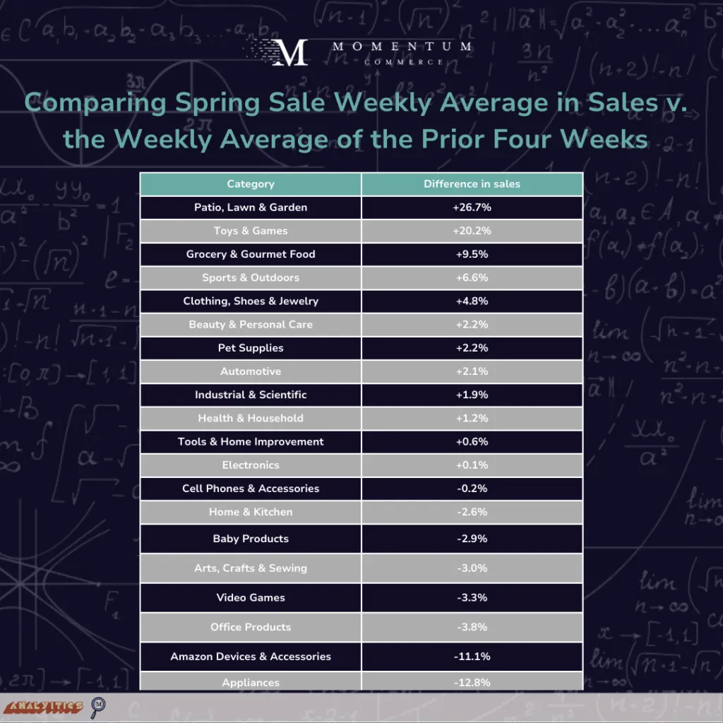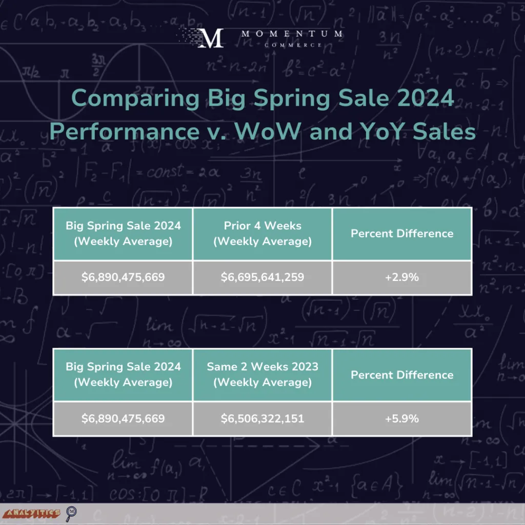 Momentum Commerce analyzed product sales, pricing, discount rates, and the presence of ‘Limited Time Discount’ badges on individual ASINs appearing at least once across the top one million search terms on Amazon between February 18 and March 25, 2024. The ‘Big Spring Sale’ period was defined as March 20 through 25, 2024, with sales figures expressed as a weekly average of the March 17 through 30, 2024 period. For YoY comparisons, the same data was drawn across the date range of March 19 through April 1, 2023, again expressed as a weekly average. Comparisons to prior sale events, including event-specific badge data were captured across the top one million search term sets during both Prime Day 2023 (July 11-12, 2023) and Big Deal Days 2023 (October 10-11, 2023).