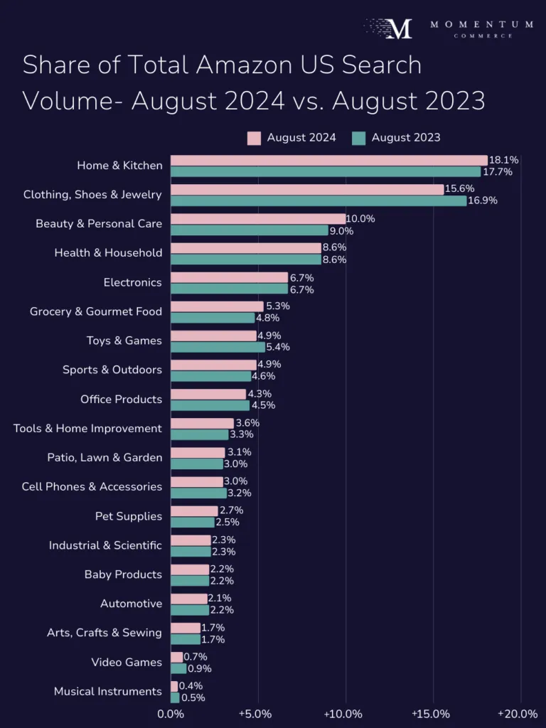 Beauty & Personal Care and Grocery & Gourmet Food gained the most share of Amazon search volume, each increasing 11% YoY