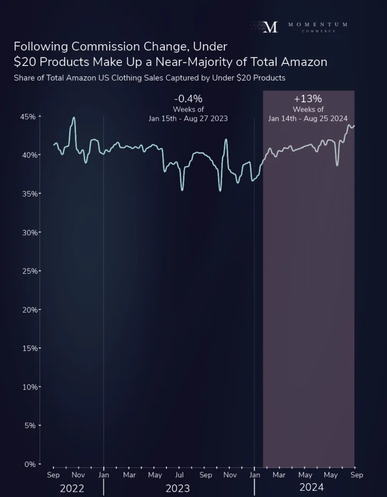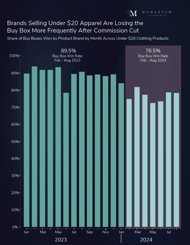 Starting on January 14, 2024, Amazon reduced its commission on lower-cost clothing products. The general consensus is that this move was in response to competitive pressure by Shein and Temu, both of which offer a wide range of low-cost apparel. Roughly eight months following the change, both the selection and sales of under-$20 clothing on Amazon have risen substantially. However, this has come at the expense of legacy brands, with the Buy Box win rates of brands selling impacted products dropping significantly since the change went into effect.