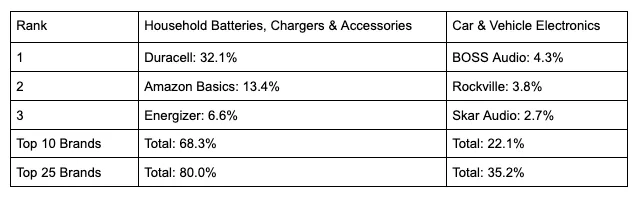 In both cases, the top few brands hold the lion’s share, but the curve is quite a bit sharper for Batteries, where the top 5% of brands hold 83% of total share, versus only 65% on Car Electronics, meaning that Batteries is a much more lopsided market than Car Electronics.