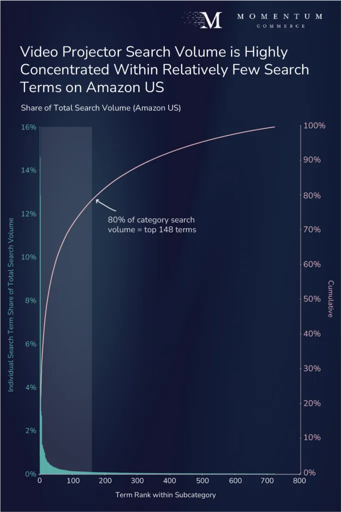 Contrast this with the Video Projector subcategory in Electronics. With just 2,000 distinct products, the top 100 search terms capture 74.6% of category search volume.