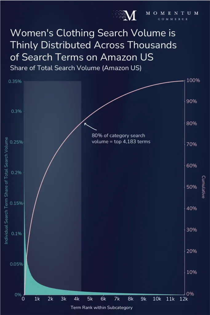 One extreme example is the largest subcategory by product count, Women’s Clothing, where the top 100 search terms account for just 15.4% of overall search volume. In fact, to account for 80% of the total category search volume in Women’s Clothing you’d have to add up the top 4,183 search terms.
