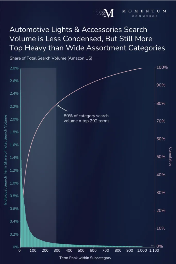 An example of a more ‘middle of the road’ category is Automotive Lights & Accessories. The category sports over 25,000 unique products, and 53.8% of category search volume is concentrated across the top 100 search terms.