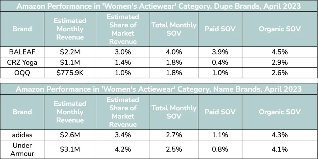 Momentum Commerce analyzed the most common lululemon ‘dupe’ brands that are currently available on Amazon. (The Cambridge Dictionary defines the term dupe as, “a short form of duplicate that refers to a product made to look like a more expensive or high-quality product.”) The hashtag #dupe has over 3.5 million TikTok views with the most recurring brands mentioned being Chinese-based companies CRZ Yoga, OQQ, and BALEAF. So how are these duped brands performing?