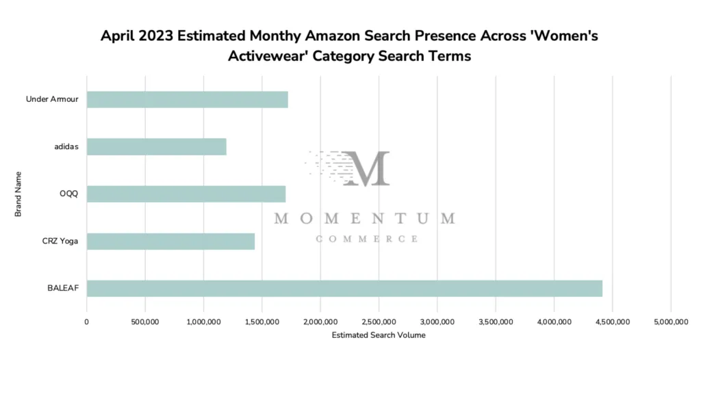BALEAF is particularly noteworthy with a 3% estimated share of market revenue and a 4% total monthly share of voice (SOV), positioning it very competitively versus the larger US brands. The estimated monthly search presence, or the number of category-relevant search terms where each brand’s products appear within the page one results, has BALEAF in the lead at 4.4M estimated searches. While lululemon’s absence from Amazon may be a strategic decision, its alternatives are successfully capturing shopper demand and staying top-of-mind within the category.