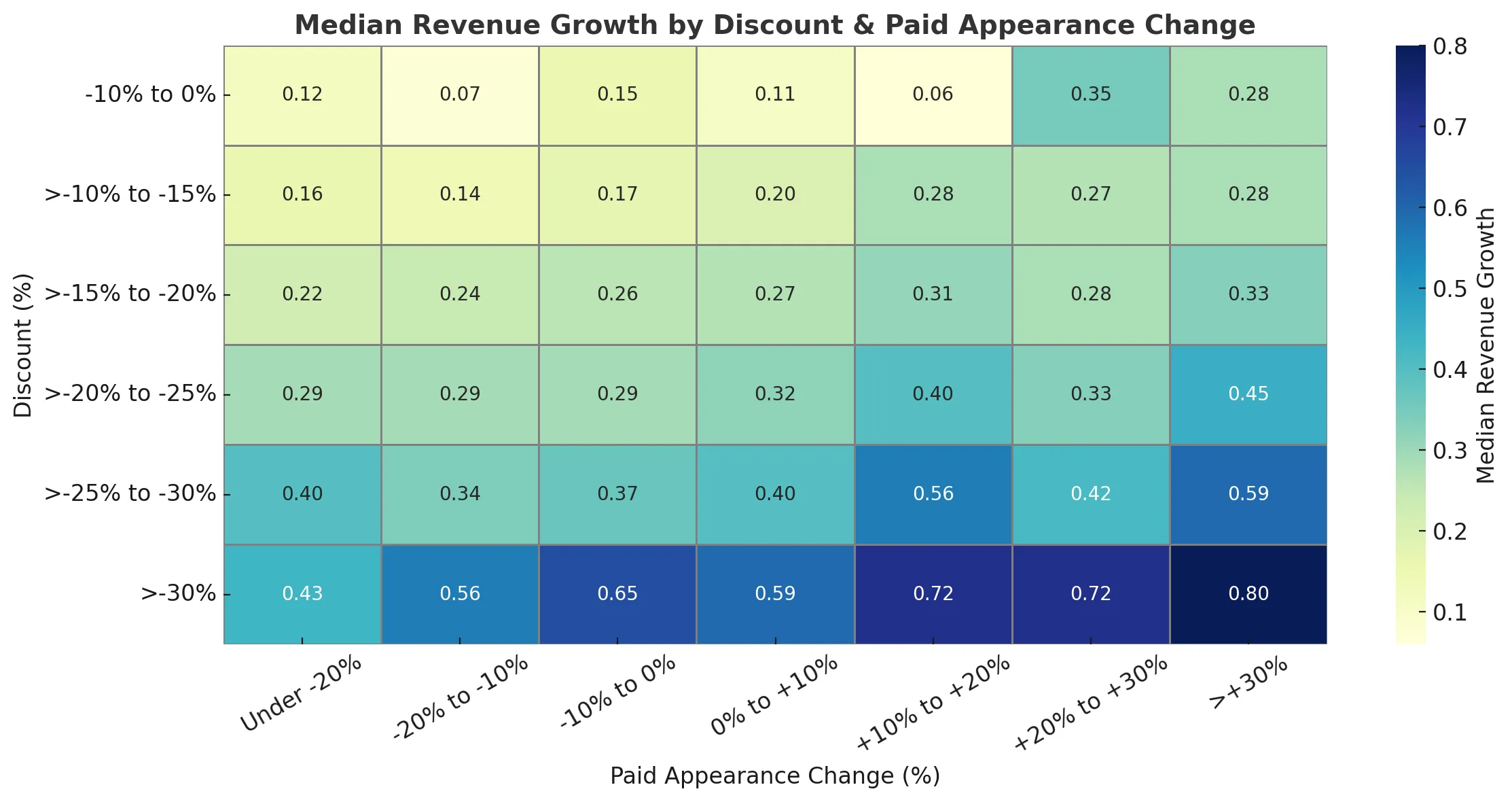 Brands that combined aggressive discounting with a noticeable uptick in paid media exposure (particularly increases of 10–30% or more) saw the most pronounced revenue gains. This reinforces the importance of developing an integrated promotional and advertising strategy, rather than treating them as separate levers. If you’re pursuing deeper discounts, back them with additional investment in search and display placements (including pre-seeding demand leading into the event) to ensure discoverability during high-intent periods.