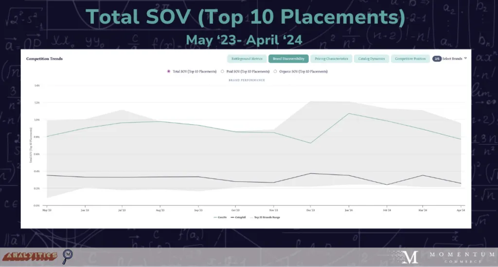 There are some interesting dynamics when it comes to Share of Voice. When looking at Total SOV across the Top 10 Placements, CeraVe remains on top for the year. However, when looking at Paid SOV in the graph below, CeraVe tends to take the back seat, allowing Cetaphil to up their paid placements beginning in August of 2023 and stretching through the rest of the year.