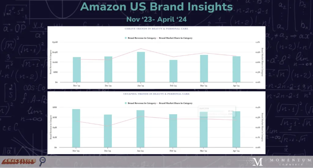Beauty & Personal Care is a thriving category on Amazon, as proven by its ever-growing +27.5% increase in search volume in April 2024, a rate that is well ahead of Amazon’s overall growth. Driven largely by social media trends, Beauty & Personal Care is home to various new entrants, and even more long-standing household names. Among these are CeraVe and Cetaphil, the skincare giants whose range of products provides a quality, gentle skincare routine for users of any age. Let’s have a skincare showdown, Amazon style: CeraVe vs. Cetaphil. Who is driving more branded searches? Who is investing in more paid ad placements? Below, we will walk through various Amazon metrics from Velocity, our Digital Shelf Analytics Platform.
