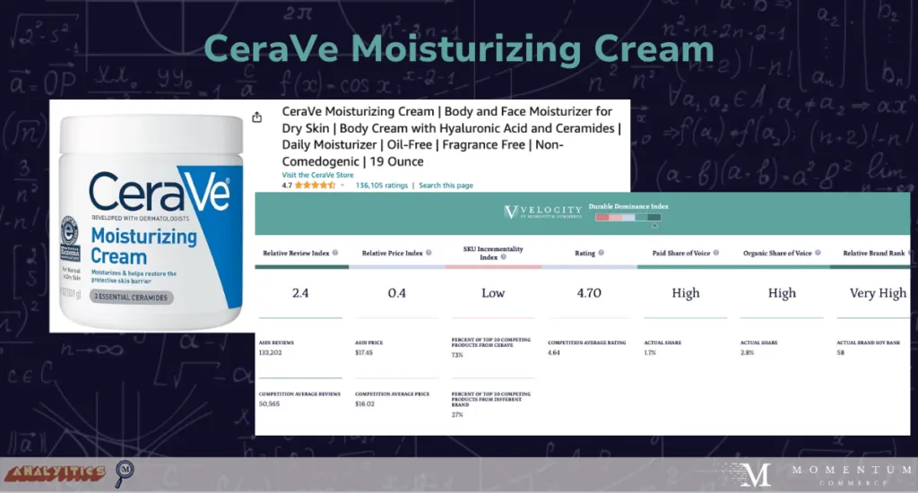 CeraVe’s top ASIN, the 19 oz. moisturizing cream for Face and Body is well positioned in terms of Momentum Commerce’s Durable Dominance Index across a number of areas including: