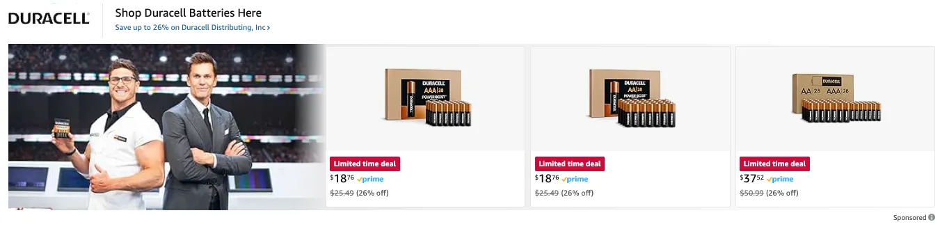 The battery brand leveraged Tom Brady's star power across both their Super Bowl commercial and Amazon presence, featuring him prominently in Sponsored Brand placements and their brand store.