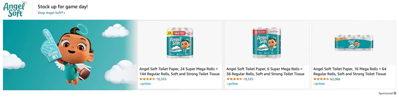 Beyond advertising spend, Angel Soft executed a complete digital shelf transformation, updating their brand storefront, Sponsored Brands ads, and product detail pages to all feature their new mascot from the Super Bowl campaign.