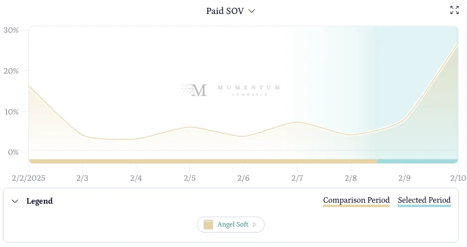 Angel Soft demonstrated one of the most comprehensive Super Bowl integrations we observed. The toilet paper brand more than doubled their paid Share of Voice (SOV) during the Super Bowl period compared to the previous week's average - outpacing every other competitor in the toilet paper category.