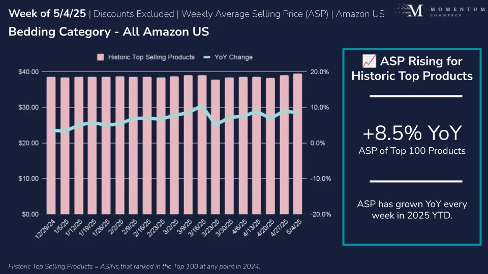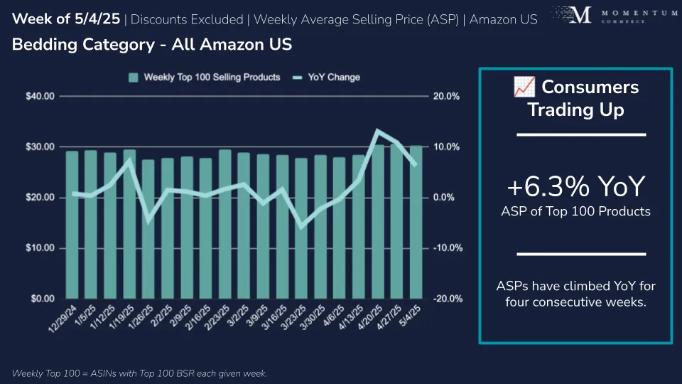 According to Momentum Commerce’s analysis, the average selling price (ASP) of the weekly 100 most popular Amazon US products in the Bedding category rose +6.3% year-over-year (YoY) for the week starting May 4, 2025.