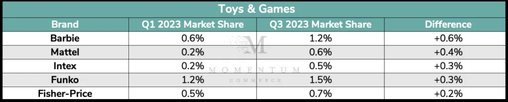 • Barbie’s place as a cultural touchstone during the summer of 2023 extended to Amazon. Between Q1 and Q3 2023, Barbie-branded products doubled their share of Toys & Games category revenue, while parent company Mattel drove the second-largest market share gain in the category. This category peaks during the holiday shopping season, so despite the encouraging trends for brands like Mattel, increased ad investments and discounting may dramatically change the competitive landscape of this category in a few weeks’ time.