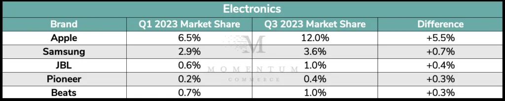• Apple was far and away the fastest-growing brand on Amazon across categories between Q1 and Q3 2023. Thanks in no small part to the launch of the iPhone 15 in September, the brand’s market share in Electronics went up by a full 5.5 percentage points - nearly doubling its share of category revenue. While not keeping pace with Apple, Samsung still grew its share of category revenue by a solid 0.7 percentage points, with Prime Day deals and the launch of the brand’s Z Fold 5 in August 2023 likely playing a role.