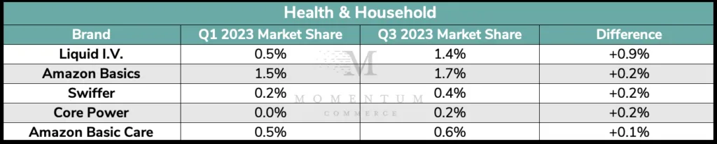 • Liquid I.V. continued its impressive trajectory observed the last time we did this report in 2022. Despite Health & Household being fast growing and the third-most popular category on Amazon overall, the brand more than doubled its share of category revenue. This is a testament to the brand’s staying power with US consumers. Amazon is also making steady progress with its private label brands. The retailer’s non-consumable Amazon Basics brand, along with its OTC medication brand Amazon Basic Care both posted top-five gains in Health & Household category market share.
