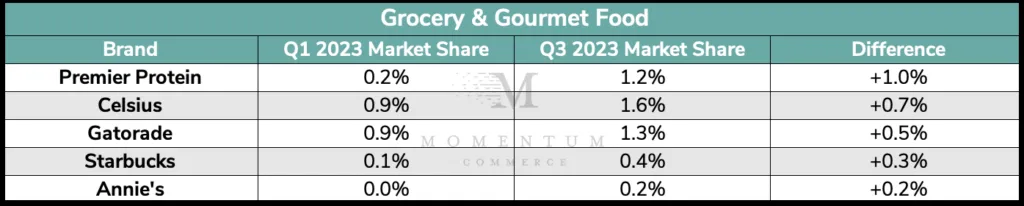 • Premier Protein had a banner Q3 2023 on Amazon, with the brand’s share of Grocery & Gourmet Food category revenue jumping more than 500% from the Q1 2023 average. This growth comes alongside branded searches for Premier Protein nearly doubling over the same time period. Celsius branded searches have been on a similar trajectory, helping the brand outpace even growing, legacy rivals like Gatorade.