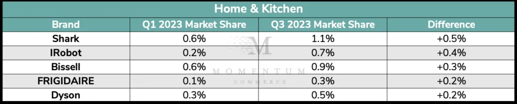 The data itself is drawn from Amazon-specific sales figures cataloged by independent, third-party sources from January 1, 2023 through September 30, 2023. To better illustrate more sustained market share growth, market share figures were averaged from the Q1 period (January through March), and then compared to the Q3 (July through September) average. Leaders are ranked based on the raw percentage point difference between the two periods.