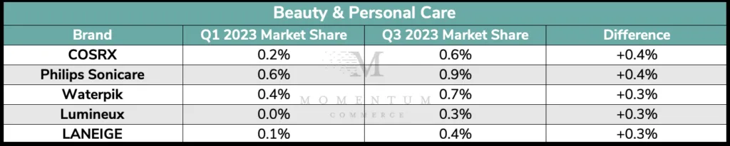 Outside of top-line growth, brands selling on Amazon should be keenly focused on whether they are growing faster than their own category. Between Q1 2023 and Q3 2023, a number of brands achieved this feat to varying degrees. While most grew their market share across top-level Amazon categories by fractions of percentage points, a select few captured even larger shares of category revenue.